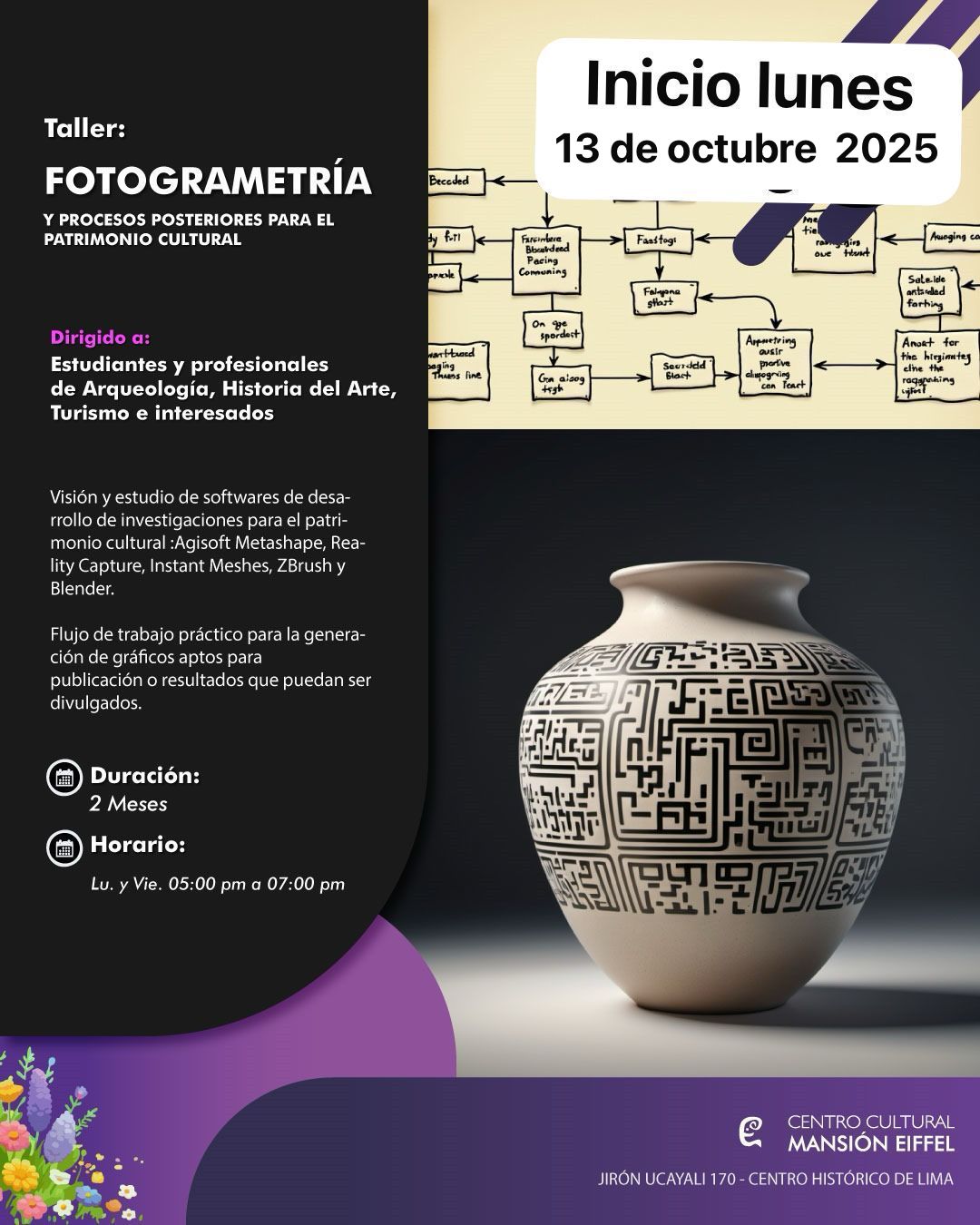 Taller de fotogrametría y procesos posteriores para el patrimonio cultural. Inicio: 16 de junio del 2025. Estudio de softwares de investigación aplicada: Agisoft, Metashape, Reality Capture, ZBrush y Blender.